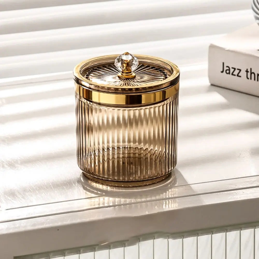 Unser rund geformter Behälter kombiniert einen transparenten Korpus mit einem farbigen Deckel und bietet sowohl Praktikabilität als auch ein elegantes Design. Durch die kompakte Grösse passt er sich nahtlos an jede Umgebung an, von Arbeitsplatten bis hin zu Schminktischen.