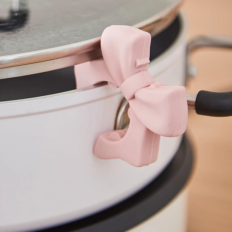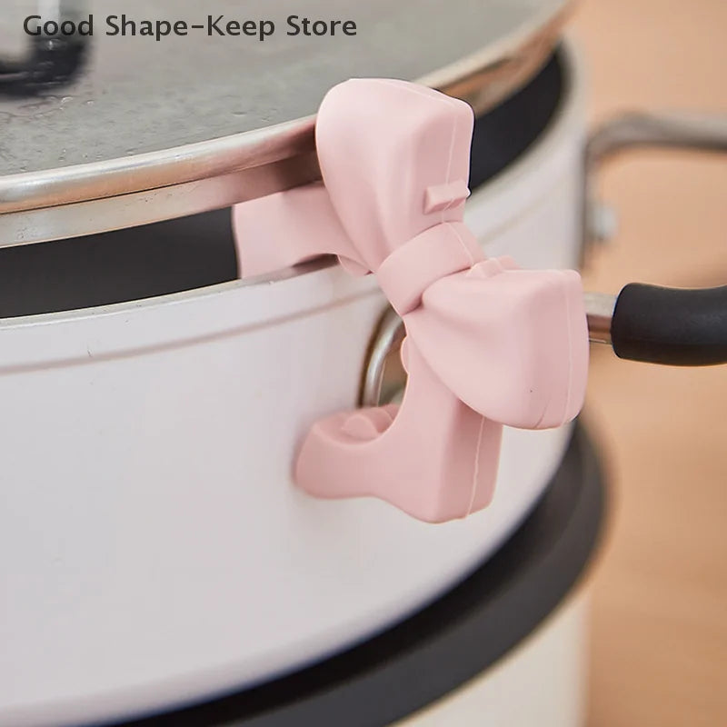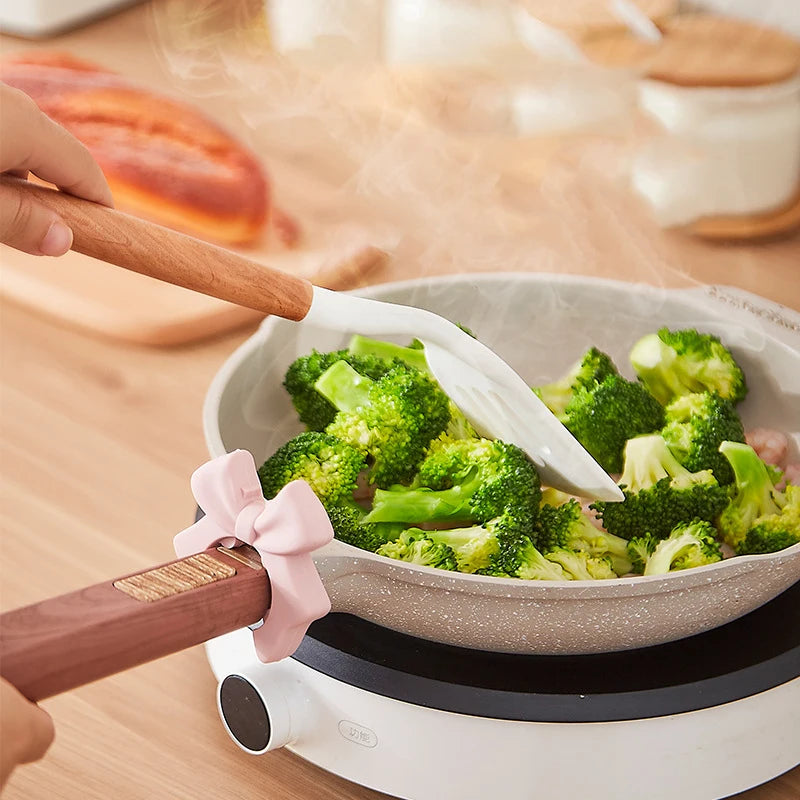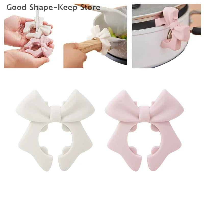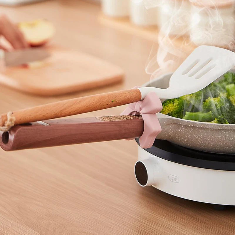 2. Dual-Funktion Bow Design: Die charmante Schleifenform verleiht nicht nur eine dekorative Note in der Küche, sondern dient auch als praktischer Utensilienhalter. Sie hält Spatel, Kellen und Deckel in Reichweite und verhindert Unordnung und Tropfen auf der Arbeitsfläche während des Kochens.