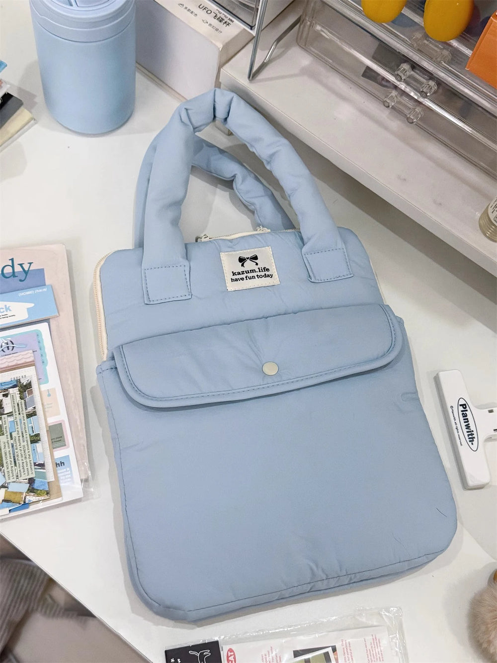 Die Tasche besteht aus robustem Polyestermaterial.