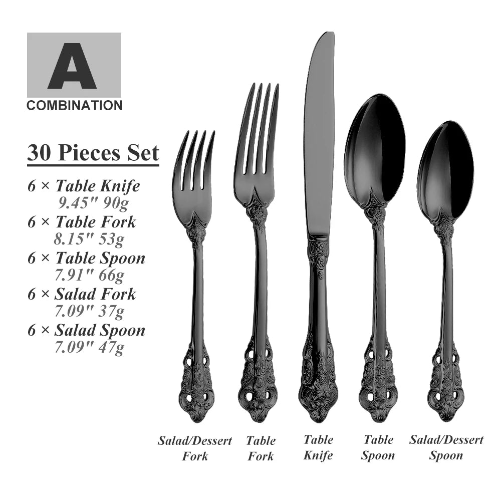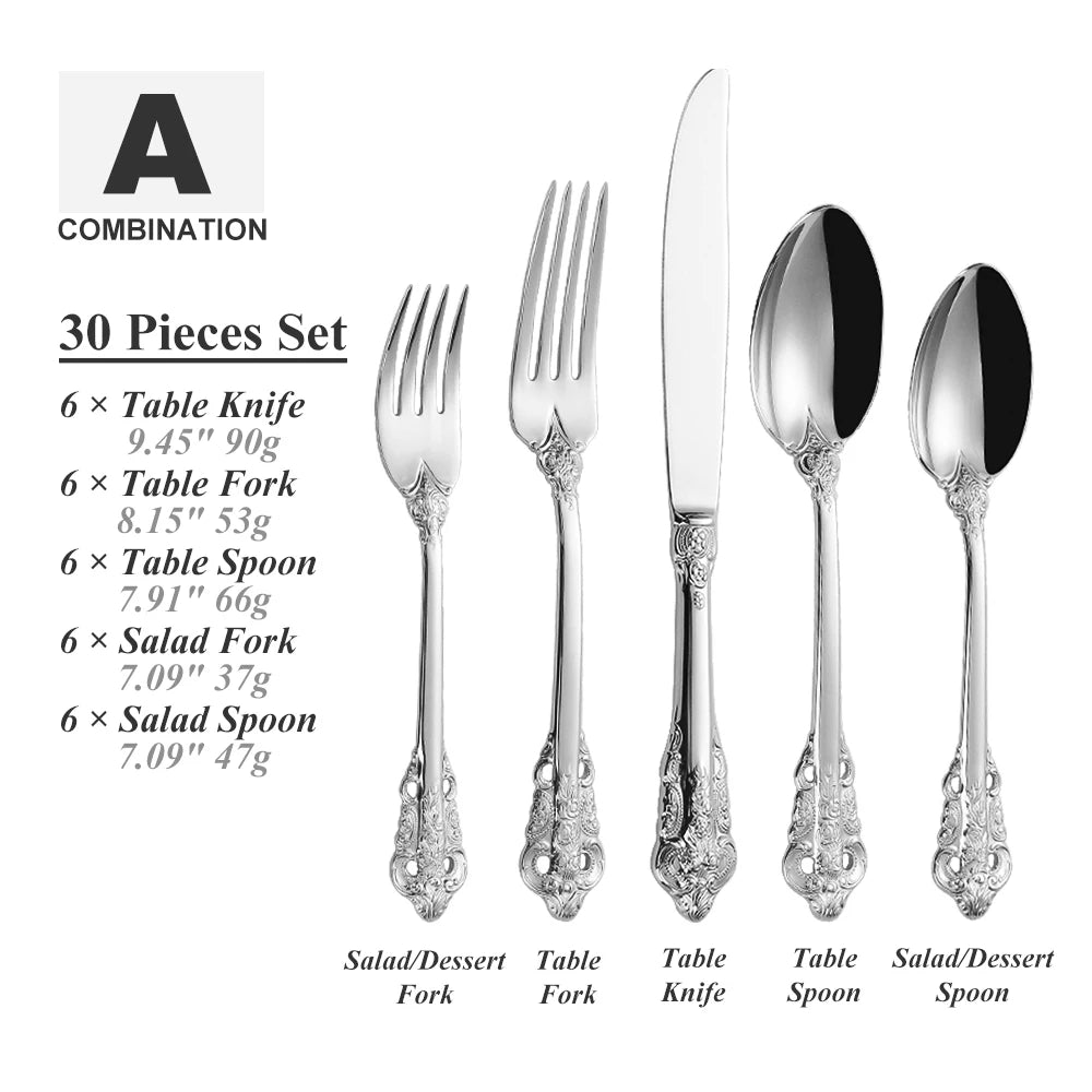 Das Set umfasst 30 Teile und bietet Service für 6 Personen, mit einer Kombination aus Löffeln, Gabeln und Messern. Jedes Teil ist spiegelpoliert für ein luxuriöses Finish.