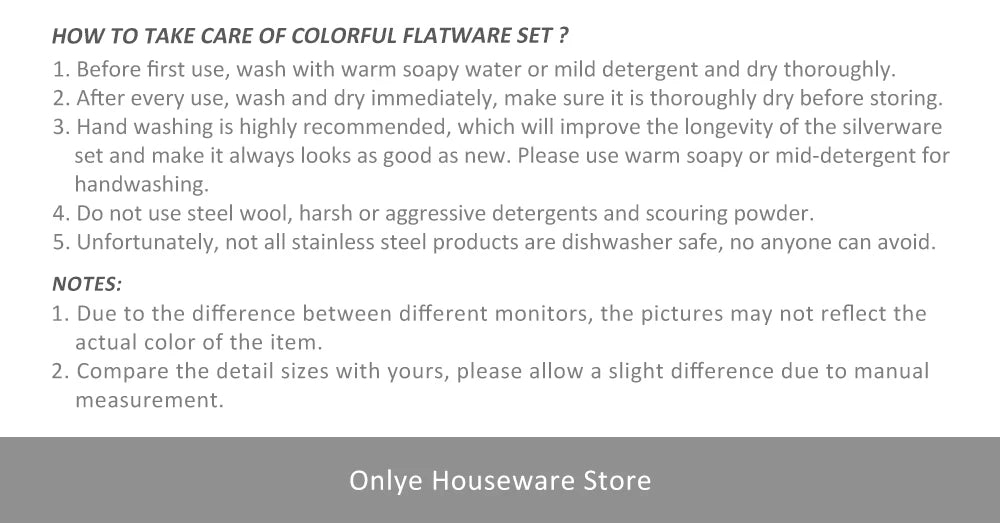 Verwenden Sie ein neutrales Reinigungsmittel, um es zu spülen, bitte verwenden Sie niemals starke alkalische oder stark oxidierende Chemikalien, um sie zu waschen. Nach der Reinigung Ihres Bestecks, bitte trocknen Sie es und halten Sie das Geschirr sauber und trocken.