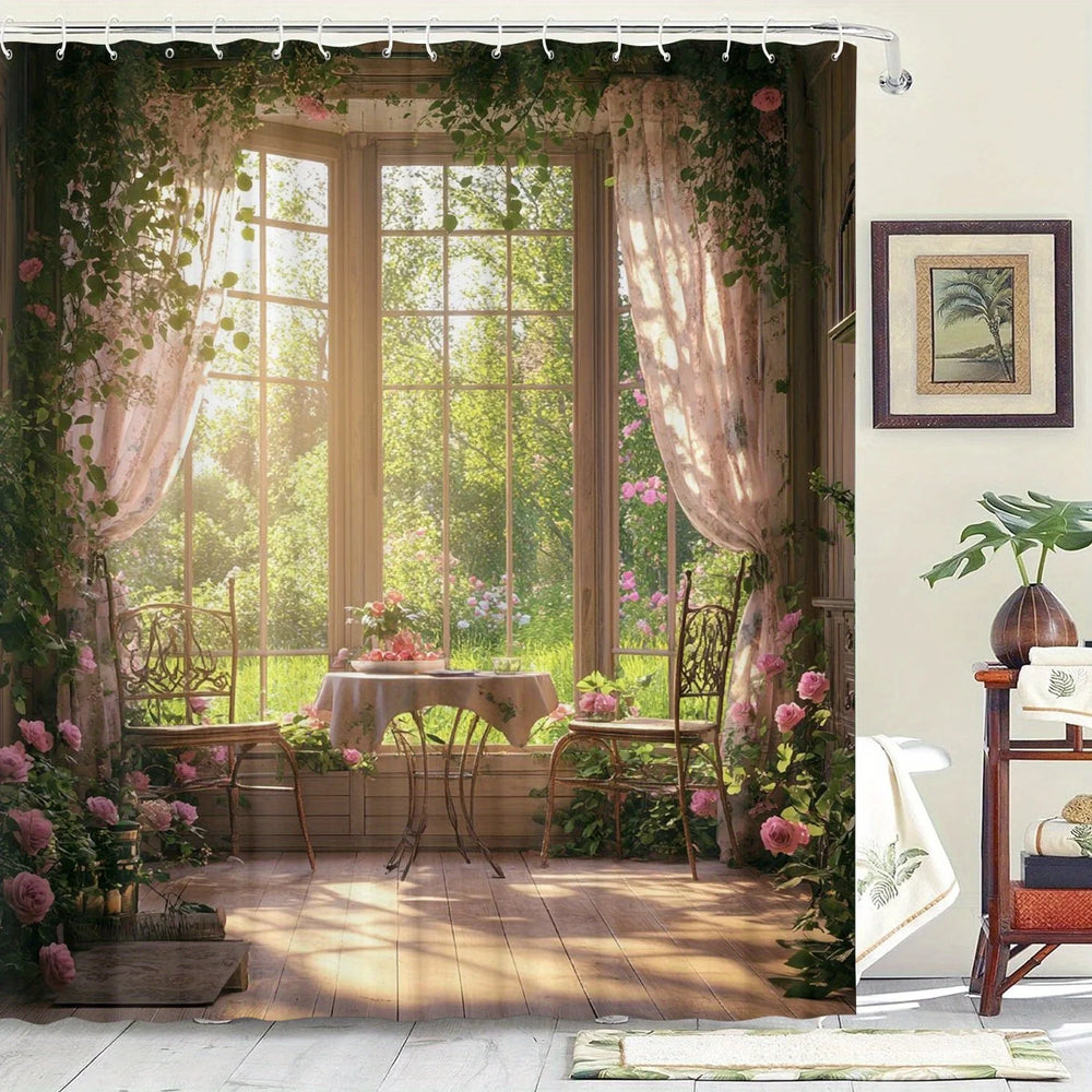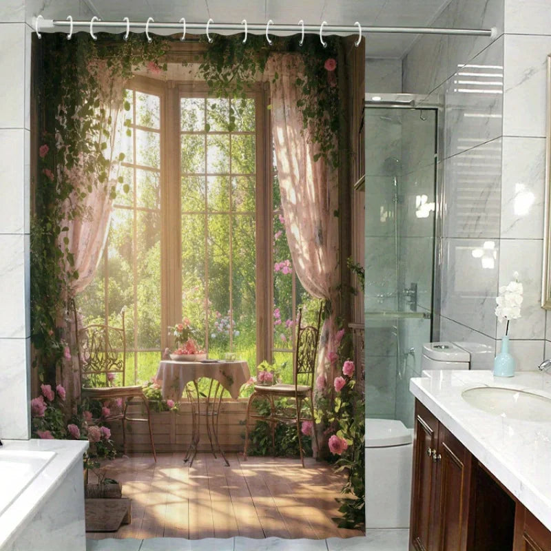 Machen Sie ein Statement in Ihrem Badezimmer mit dem Wald-Fenster-Duschvorhang. Dieses naturinspirierte Design sorgt für Ruhe und funktionale Nutzung.