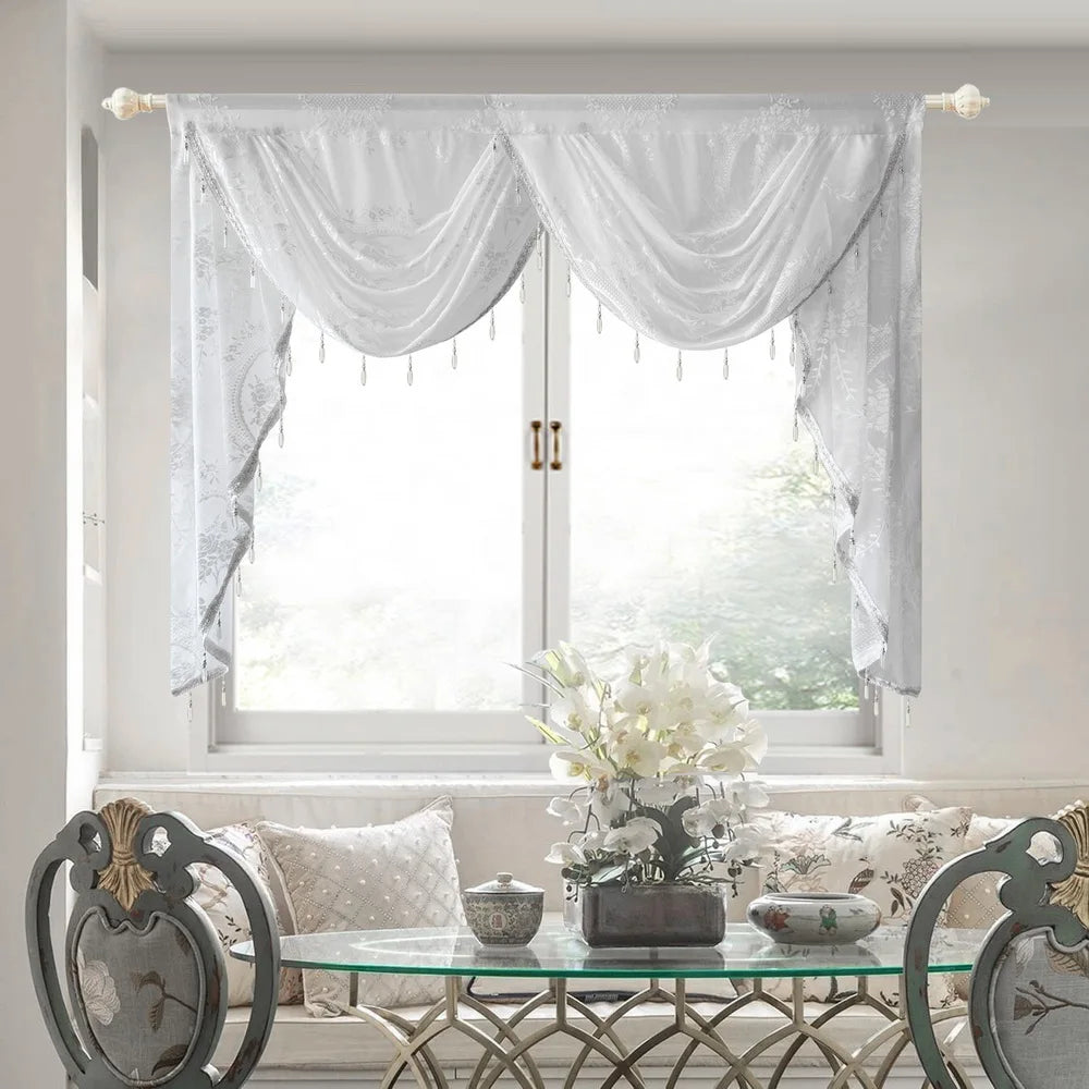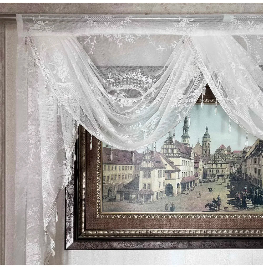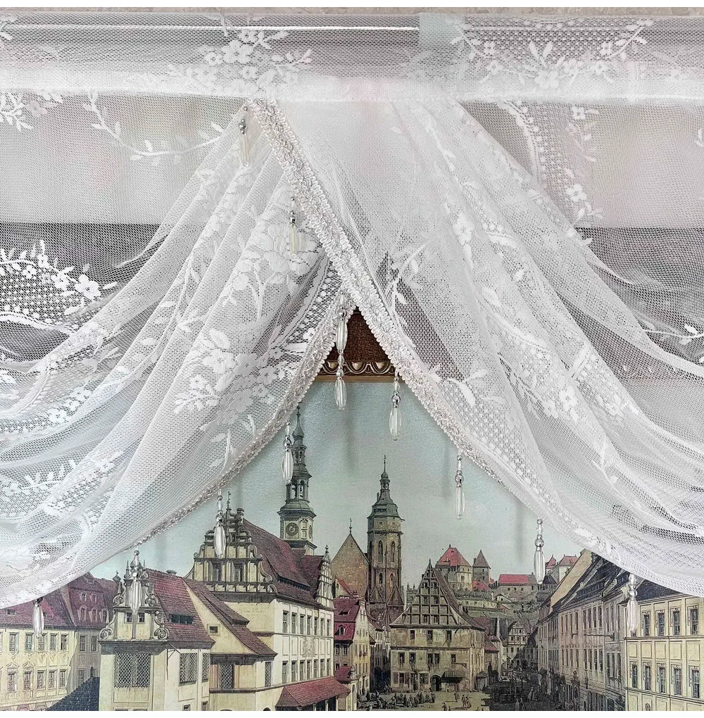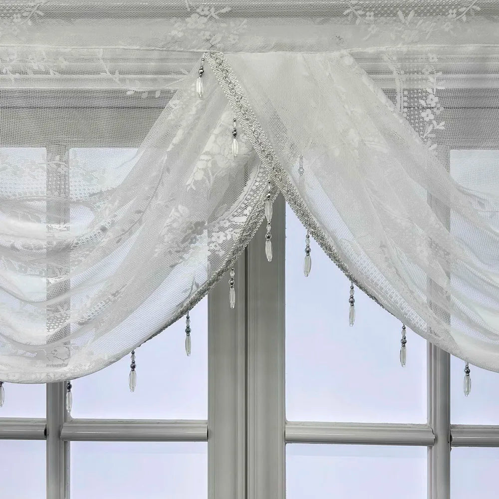 Verwandeln Sie Ihr Wohnzimmer in einen Zufluchtsort voller Luxus und Eleganz mit unserer weissen Spitzen-Scheibengardine. Zart gestaltet mit bestickten Blumenperlen, verleiht sie jedem französischen Fenster einen Hauch von Raffinesse.